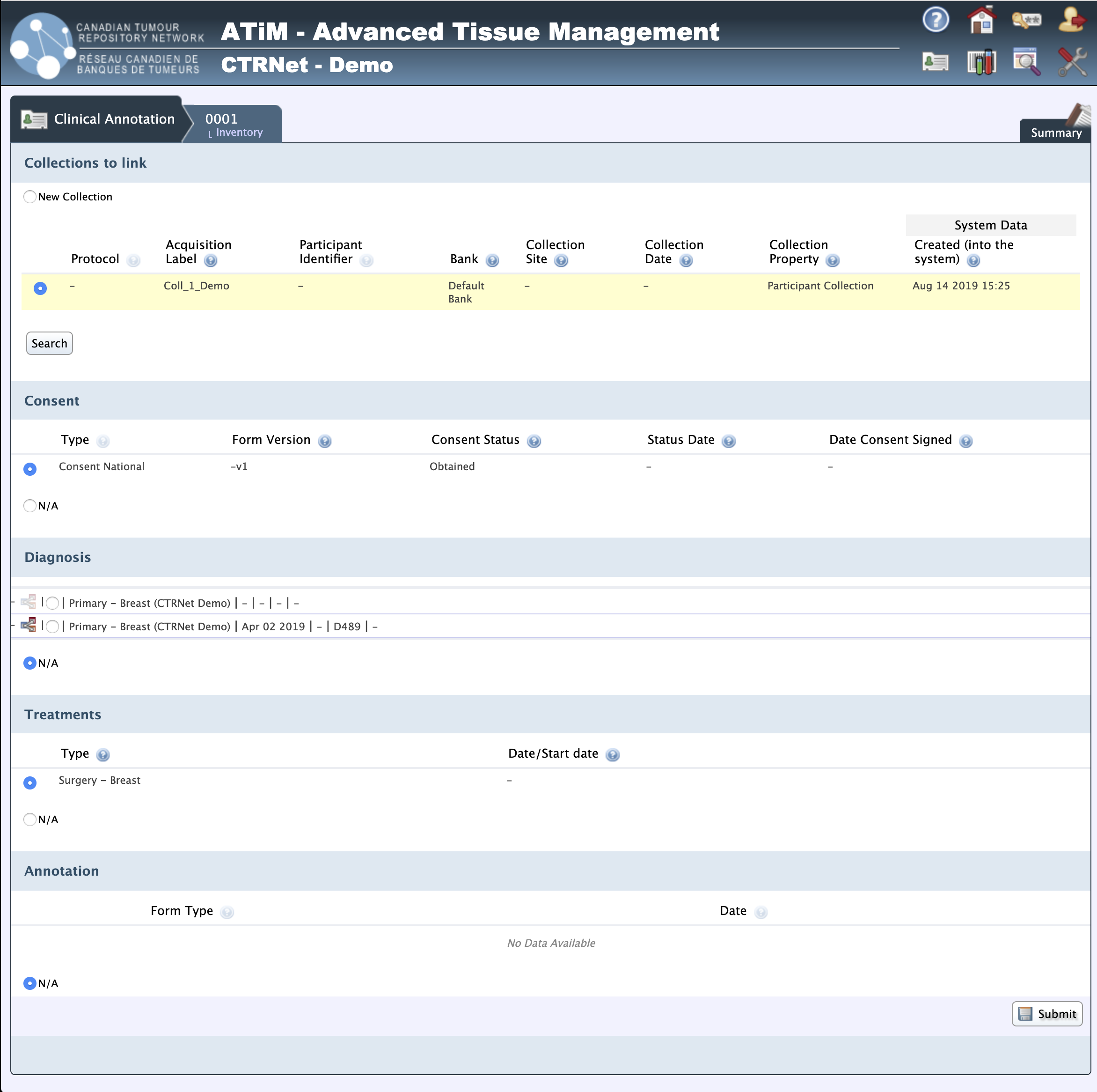- You are now in the ‘Inventory’ module. The collection you are invited to create will be linked to your participant. Fill the form and hit ‘Submit’.